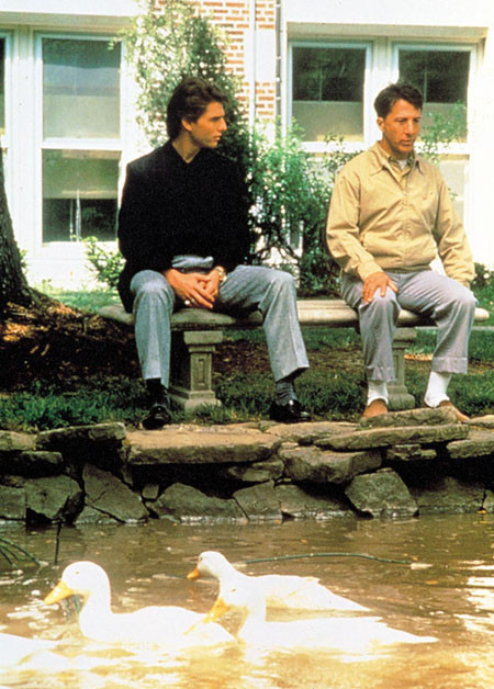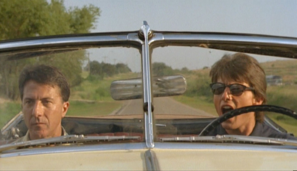 처음엔 오직 유산을 되찾으려는 목적으로 레이먼드를 만나러 간 찰리는, 담당 의사 ‘브루너 박사‘(제럴드 몰렌)의 반대에도 불구하고 레이먼드를 몰래 데리고 나와 호텔로 갑니다. 이 과정에서 레이먼드를 제대로 대우하지 않는 찰리에게 실망한 수잔나는 결국 그를 떠나게 됩니다. 레이먼드는 감정 표현이 서툴고 반복적인 행동을 보이지만, 암기력과 계산 능력이 뛰어난 서번트 증후군 환자입니다. 찰리는 보호자 자격을 얻고 유산의 일부라도 얻기 위해 레이먼드를 차에 태우고, 고소공포증 때문에 비행기를 탈 수 없어 육로로 로스앤젤레스로 향하는 길에 오릅니다.