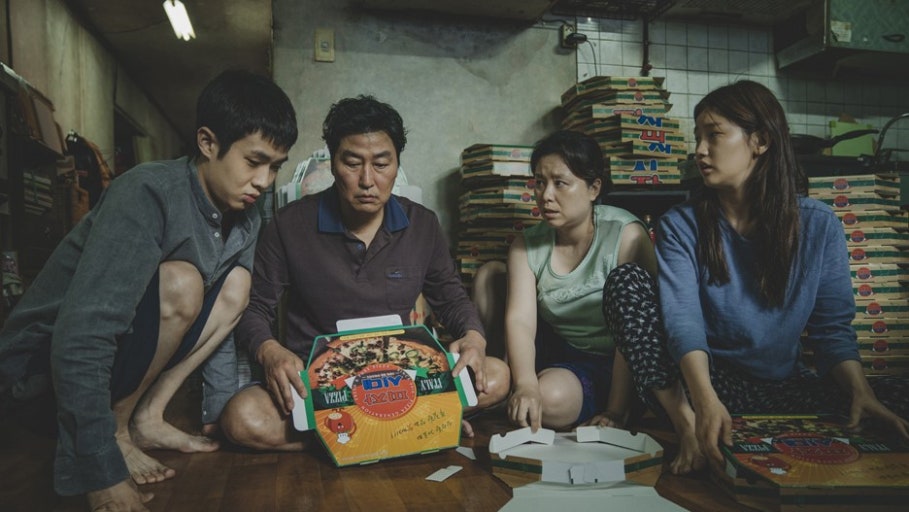 영화는 ‘김기택’(송강호), 아내 ‘박충숙’(장혜진), 아들 ‘김기우‘(최우식), 딸 ’ 김기정‘(박소담)으로 구성된 네 식구가 반지하 집에서 가난하게 살아가는 풍경에서 시작합니다. 기택 가족은 무료 와이파이를 찾아다니고 피자박스 접기 아르바이트로 근근이 생활합니다.