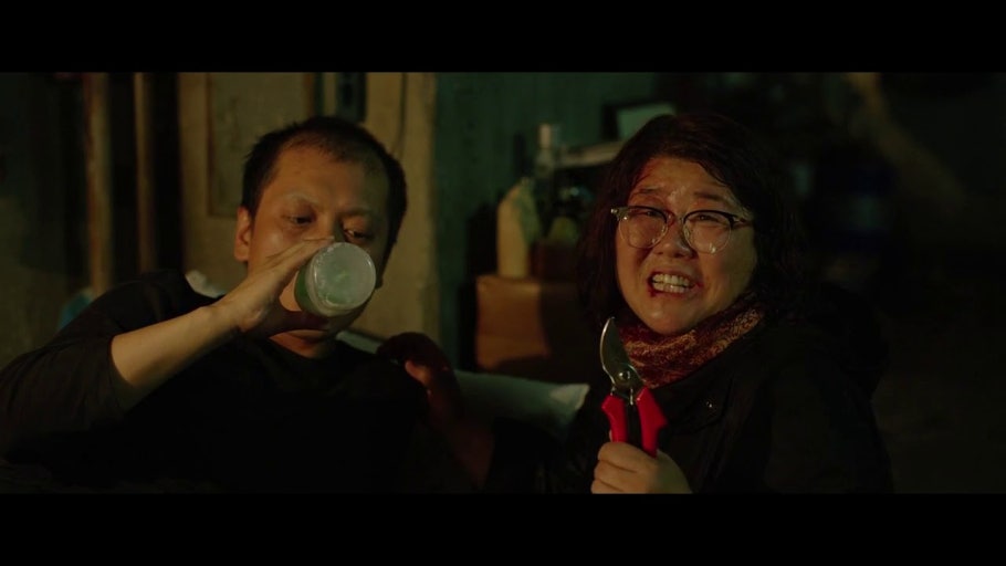 박 사장 가족이 다송의 생일 캠핑을 떠난 밤, 기택 가족은 집에서 주인 행세를 하며 파티를 즐기다 문광이 갑자기 찾아옵니다. 문광은 자신이 물건을 맡겼다는 핑계로 들어와 지하실의 비밀 공간에 내려가 남편 ‘근세’(박명훈)를 돌보고 있었던 충격적인 사실을 드러냅니다. 두 가족은 갈등 끝에 서로의 정체를 박사장 가족에게 들키지 않으려 협박과 충돌을 반복합니다. 이때 박사장 가족이 캠핑장에서 폭우를 맞아 예정보다 빨리 귀가하고, 기택 가족은 겨우 몸을 숨깁니다.