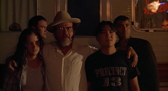 <황혼에서 새벽까지>는 90년대 B급 그라인드하우스 미학의 정수이자 타란티노-로드리게즈 콜라보의 환상적인 산물로, 범죄 로드무비에서 뱀파이어 슬래셔로의 즉발적 전환을 통해 관객의 기대를 산산조각 내는 쾌감이 압도적입니다. 전반부 세스와 리치의 날카로운 대사와 긴장된 인질극은 타란티노 특유의 펄프 픽션 스타일로 완벽하게 조율되며, 하비 카이텔의 신앙 상실한 목사와 줄리엣 루이스의 터프한 케이트가 더해져 캐릭터 드라마마저 탄탄하지만, ‘티티 트위스터’ 클럽에 들어서자마자 셀마 헤이엑의 산타니코 댄스로 폭발하는 후반부는 피와 고어, 즉석 무기가 난무하는 카오스 파티로, 로드리게즈의 편집이 그 황당함을 오히려 중독적으로 만듭니다.