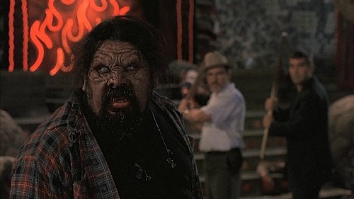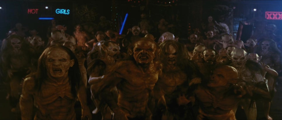 2) 이 영화의 재미는 범죄 누아르에서 어반 판타지로 장르가 변신하는 점으로 초반에 로드리게스 특유의 로드 무비 같은 모습이 이어지다 갑자기 뱀파이어 액션물로 돌변하는 것이 포인트입니다. 전까지는 배우들은 시종일관 진지하지만 이후 대사와 행동은 병맛이 따로 없는 탓에 상당히 코믹한 부분이 많습니다. 그리고 로버트 로드리게즈 특유의 속도감 넘치는 편집 기술과 예측 불허의 전개에서 오는 재미 또한 꽤 높이 평가받아야 할 부분입니다. 리치가 산타니코에게 물려 사망하는 장면을 기점으로 상황이 바뀝니다. 평소 로드리게스와 타란티노의 성향을 모르는 관객이 이 영화를 본다면 놀랄 법도 합니다.