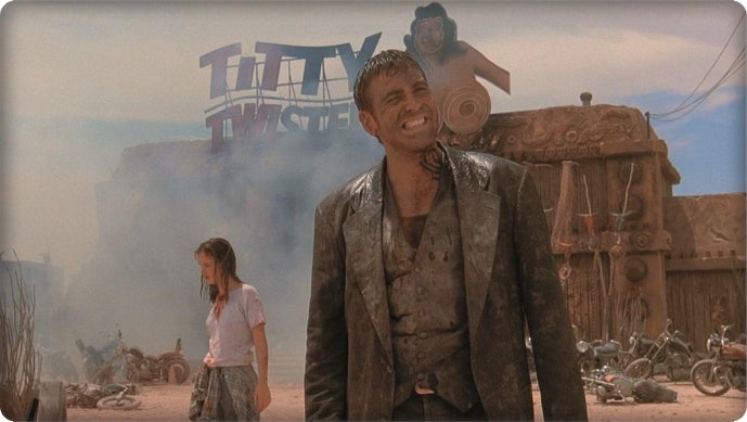 마침 모텔에 도착한 ‘제이콥 풀러‘(하비 카이텔) 목사와 딸 ‘케이트‘(줄리엣 루이스), 아들 ‘스콧‘(어니스트 리우)의 캠핑카를 강탈하며 인질로 삼습니다. 국경 검문소에서 케이트의 대담한 연기와 리치를 기절시킨 덕에 멕시코로 무사히 넘어갑니다. 황혼 무렵 그들은 세스의 동료 ‘카를로스‘(치치 마린)를 만나기 위해 ’ 티티 트위스터(Titty Twister)’라는 아즈텍풍 스트립 클럽에 도착해 술을 마시며 기다리는데, 클럽 안은 험악한 트럭 운전사들과 무희들이 가득합니다.