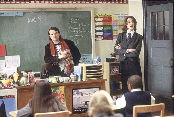 결국 록 밴드를 그만두고 대리 교사로 일하는 친구 ‘네드 슈니블리‘(마이크 화이트)의 집에 얹혀살며 허구한 날 그의 동거녀인 여자친구와도 다투고 월세까지 밀리자 고민에 빠집니다. 그러던 어느 날 호레이스 그린 사립 초등학교에서 대체 교사를 구하기 위해 네드에게 전화가 오는데, 마침 네드가 없던 터라 듀이는 몰래 네드의 이름을 빌려 자신의 네드 슈니블리 라며 교장인 로잘리를 전화로 속인 뒤 호레이스 그린 사립초등학교의 대리교사로 일하기로 합니다.