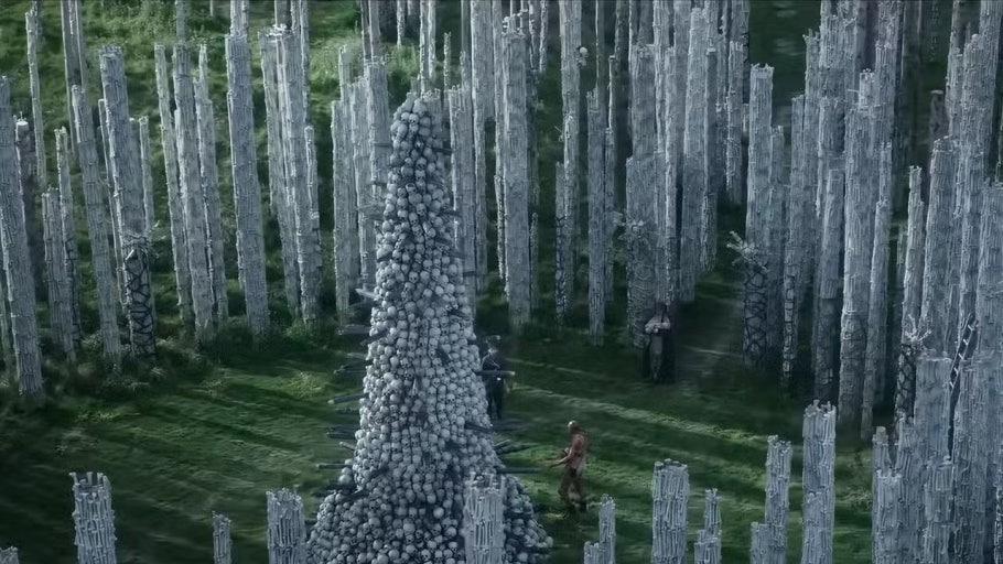 영화의 중심 장소인 “뼈의 사원”은 대부분 CG가 아니라 실제 대형 세트로 제작되었습니다. 제작진은 수천 개의 인공 뼈 모형을 사용해 거대한 납골 구조물을 만들었으며, 배우 랄프 파인즈가 연기한 의사 캐릭터의 고립된 세계를 강조하기 위해 폐허 속 성당 같은 느낌을 의도적으로 디자인했습니다. 이 세트는 촬영 당시 배우들에게도 상당히 압도적인 분위기를 주었다고 합니다. - 광신 집단 설정의 현실적 참고 자료