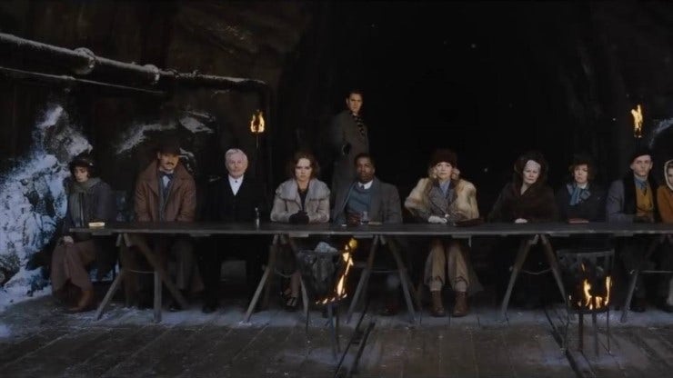 영화의 하이라이트이자 결말인 범인 폭로 장면은 눈 덮인 터널 앞에서 이루어집니다. 케네스 브래너 감독은 12명의 승객을 긴 탁자에 일렬로 앉혔는데, 이는 레오나르도 다 빈치의 명화 <최후의 만찬>을 노골적으로 오마주한 연출입니다.