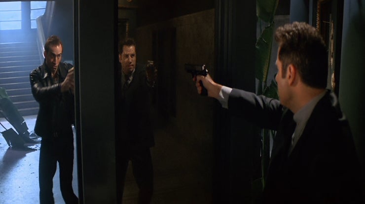 2) 처음 각본을 쓸 때는 아놀드 슈워제네거와 실베스터 스탤론을 염두에 두었다고 합니다. 각본가 말로는 스탤론이 "I'll be back." 하는 걸 보고 싶었다나... 이외에도 해리슨 포드와 마이클 더글라스, 브루스 윌리스와 피어스 브로스넌, 알 파치노와 로버트 드 니로, 장 클로드 반담과 스티븐 시걸이 고려됐었다고 합니다. 이 중에서 실제로 마이클 더글러스는 출연까지 하려고 했었다고 합니다. 덤으로 마크 월버그에게 가장 먼저 폴럭스 트로이 역의 제의가 갔지만 거절했다고 합니다. 저렇게 유명배우를 섭외하려고 애쓸만한 게, 이 영화에서 A라는 역의 배우는 'A의 역할', 'A의 모습을 한 B의 역할'에 'A의 모습을 한 B가 다른 사람들 앞에서 A인 척하는 역할'까지 제각기 모두 자연스럽게 연기해야 합니다. 어지간한 연기력과 캐릭터 연구 없이는 해낼 수 없는 일일 것입니다. 거기다 영화적 재미를 위해서는 사람들에게 친숙한 이미지가 있을 정도로 유명한 배우여야 하기까지 했습니다. 실제로 존 트라볼타와 니콜라스 케이지는 오랫동안 합을 맞춰가며 연기 연습을 해야 했다고 합니다.