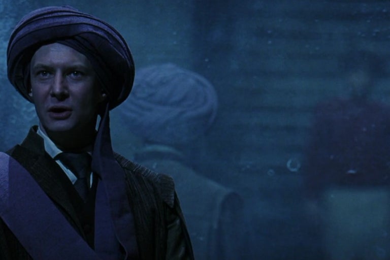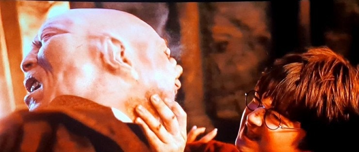 볼드모트는 해리와 직접 대면하겠다고 하자 퀴럴이 터번을 벗고 뒤통수를 보이는데, 볼드모트의 얼굴이 퀴럴의 뒤통수에 기생하고 있었습니다. 해리는 도망치려 했으나 실패하고, 퀴럴이 그를 잡으러 오나 그의 손이 해리의 몸에 닿자마자 화상을 입게 되고, 해리는 잽싸게 퀴럴의 얼굴에 손을 갖다 댑니다. 흉터의 통증으로 해리는 결국 암흑 속으로 떨어집니다.