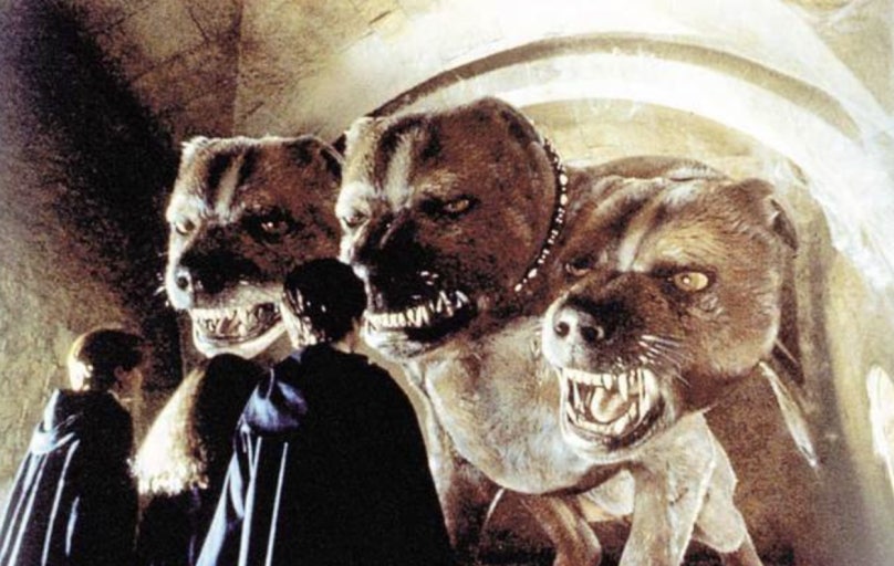 해리가 퀴디치 팀에 가입했다는 사실을 안 말포이는 해리에게 마법사 결투를 요청하고, 해리는 승낙합니다. 그날 자정, 약속 장소로 가려는데 모종의 이유로 해리, 론, 헤르미온느, 네빌이 함께 가게 됩니다. 그러나 사실 말포이는 없었고, 그들은 관리인에게 쫓기다가 어느 방에서 지하실 문을 발로 밟고 있는 머리가 3개 달린 거대한 개를 발견하게 됩니다.